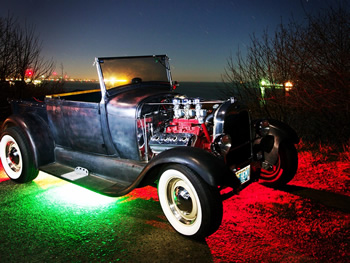 This guy is a 1928 Model A pick-up with a 331ci. Hemi, auto tranny, Ford rear end, dropped front axel, four wheel disc brakes with radial white walls.